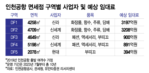 DF1(4258㎡)과 DF3(4649㎡) 구역에 입점한 호텔신라의 연간 예상 임대료는 4097억원, DF2(4709㎡)와 DF4(5198㎡) 구역을 낙찰받은 신세계디에프는 연간 예상 임대료는 4099억원이다. DF5(2078㎡)에 입점한 현대백화점면세점은 연간 예상 임대료가 394억원으로 파악된다. 이는 입찰가에 2019년도 인천공항 출발 여객 수(3557만명)을 반영한 금액이다.