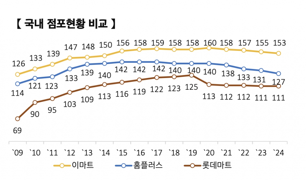 롯데마트는 2019년 125개의 점포를 운영하고 있었으나 지금은 111개까지 줄었다. 2019년 기준 158개 점포를 운영하던 이마트가 올해 153개를 운영하고 있는 것과 비교해 폐점률이 높다.