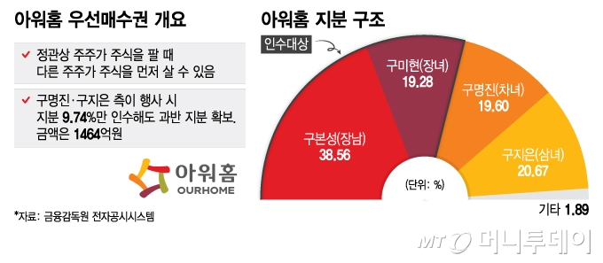 실제로 아워홈은 정관상 주주가 주식을 팔 때 다른 주주가 주식을 먼저 살 수 있는 우선매수권이 있다. 구명진·구지은 연합이 구본성·구미현 연합에 지분 매각을 요구할 수 있는 기회가 생긴 것이다. 게다가 한화호텔과 같이 약 60% 지분을 한번에 매입할 필요가 없다. 이미 지분 40.27%를 보유하고 있어 구본성·구미현 연합측 지분 9.74%만 확보해도 과반 지분을 확보할 수 있어서다. 한화호텔과 맺은 계약에 따라 1주당 가격으로 계산하면 전체 인수금액은 1464억원이 된다.