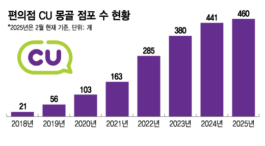 CU는 2018년 8월 울란바토르에 1호점을 개점한 뒤 빠르게 출점을 확대하며 2023년 3월 300호점을 달성했다. 국내 유통기업이 해외에서 300호점 이상 개점한 것은 CU가 처음이다. 지난해 7월에는 400호점을 열었고, 현재 460개 점포를 운영 중이다. 연내 500호점 돌파가 유력하다. CU의 몽골 편의점 시장 점유율은 70%를 넘어 독보적인 1위다.