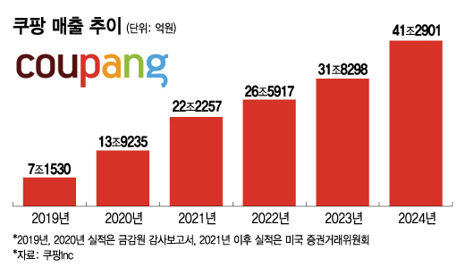 국내 이커머스(전자상거래) 1위 업체인 쿠팡의 지난해 매출이 40조원을 넘어섰다.쿠팡이 2023년 유통업계 최초로 연매출 30조원을 돌파한 지 1년 만에 '40조 클럽'까지 선점한 것이다. 대형마트·백화점 등을 기반으로 수십년간 국내 유통 시장을 지켜온 대기업도 달성하지 못한 매출 신기록을 잇달아 갈아치우면서 업계 판도를 바꾸고 있다.