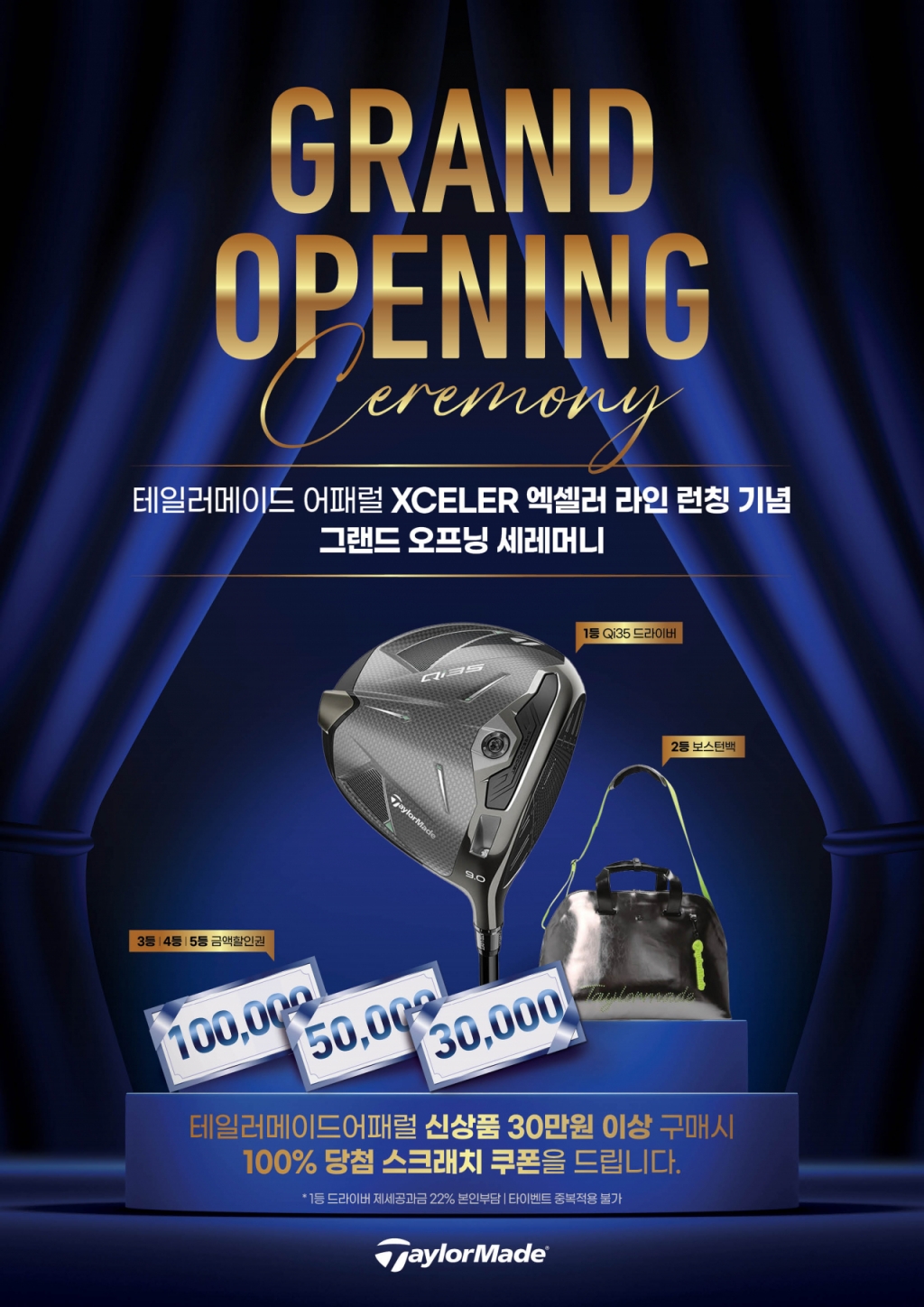 다음달 30일까지 진행되는 이번 프로모션 기간 매장 및 자사몰에서 신상품을 30만원 이상 구매하면 100% 당첨 스크래치 쿠폰을 제공한다. 경품으로 1등과 2등에게 테일러메이드 Qi35 드라이버, 보스턴백을 각각 증정하며 3등, 4등, 5등에게는 각 금액별 할인권을 증정한다.