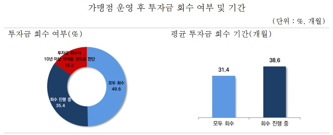 또 투자금을 회수한 업체(49.6%)들의 평균 소요기간은 31.4개월로 집계됐다. 회수 진행 중이라는 35.4%는 평균 38.6개월이 소요될 것으로 예측했다. 이에 비춰볼 때 창업 후 3년 정도 지나야 투자금을 모두 회수할 수 있다는 추정이 가능하다. 다만 10년 이상 어려울 것으로 판단한 가맹점도 15%에 달해 그 기간은 더 늘어날 수 있다.