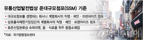 대기업 자본이 직접 운영하는 점포가 아니라 자영업자들이 자신의 자본을 투자해 운영하는 경우도 GS더프레시나 롯데슈퍼, 이마트에브리데이, 홈플러스익스프레스 등 대기업 SSM 간판을 사용하면 동일한 규제가 적용돼왔다는 얘기다. 이들 SSM은 전통상업보존구역 반경 1km 내에는 출점이 불가능하고 영업시간도 오전 10시부터 자정까지로 제한된다. 지방자치단체 조례에 따른 주말 의무휴업 규제도 받는다.