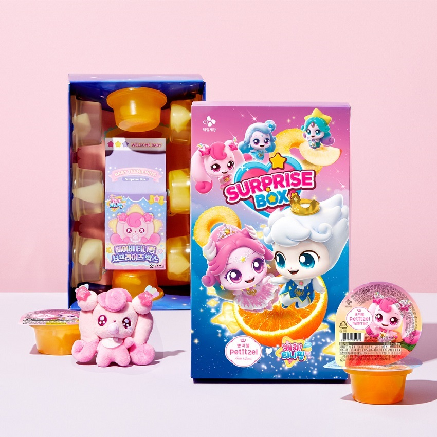 '쁘띠첼 & 캐치! 티니핑 서프라이즈 박스'를 출시해 '카카오톡 선물하기'에서 지난달 28일부터 판매를 시작했다. 서프라이즈 박스는 쁘띠첼 과일젤리 8개(복숭아 3개, 파인애플 3개, 밀감 2개)와 티니핑의 인기 굿즈인 '베이비 티니핑 키링' 인형(8종 가운데 랜덤 1개)으로 구성됐다.