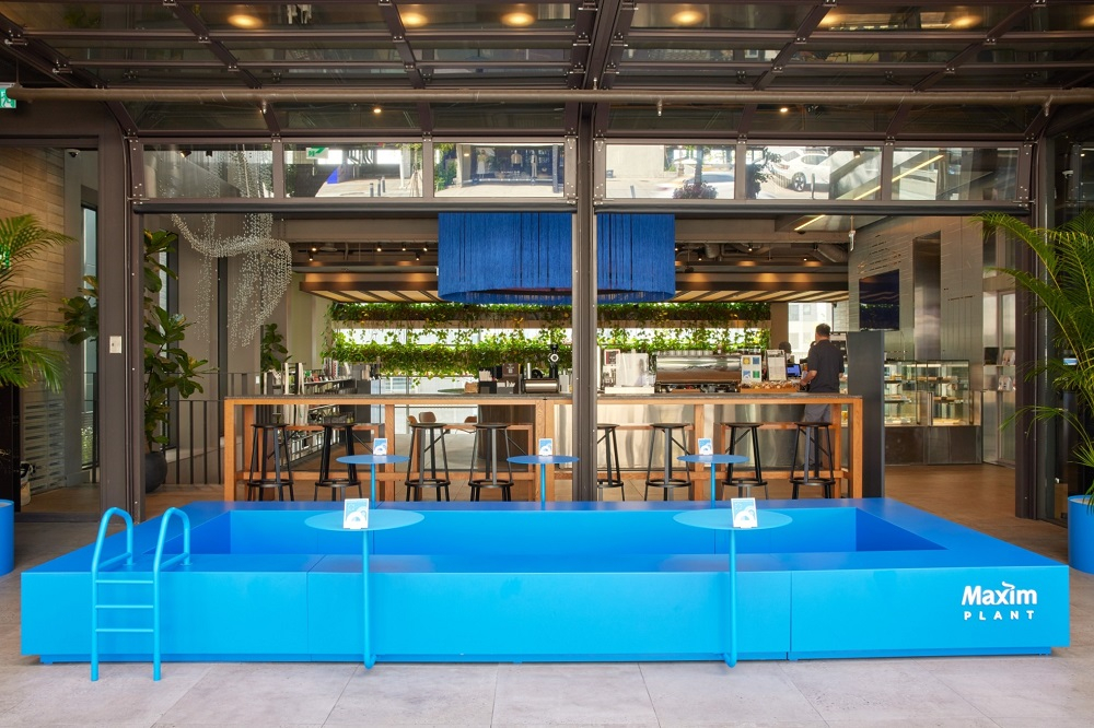 올 여름 맥심플랜트는 'Blue in Maxim Plant'(블루 인 맥심플랜트)라는 콘셉트에 맞춰 시원한 오아시스의 느낌을 더한 게 특징이다. 1층 폴딩도어 앞에는 파란색 수영장을 연상시키는 공간을 설치해 도심 속 바캉스 감성을 느낄 수 있다. 중앙 카운터 상단에는 푸른빛 실커튼을 드리워 한층 청량한 무드를 연출했다.