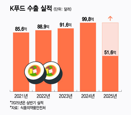 K푸드 수출은 올해에도 역대 최대치를 경신할 전망이다. 농식품부에 따르면 올해 상반기 K푸드 수출액은 51억6000만달러로 전년 동기 대비 8.4% 증가했다. 이런 흐름이 이어지면 역대 최초로 K푸드 수출액이 연간 100억달러를 돌파할 것으로 보인다.