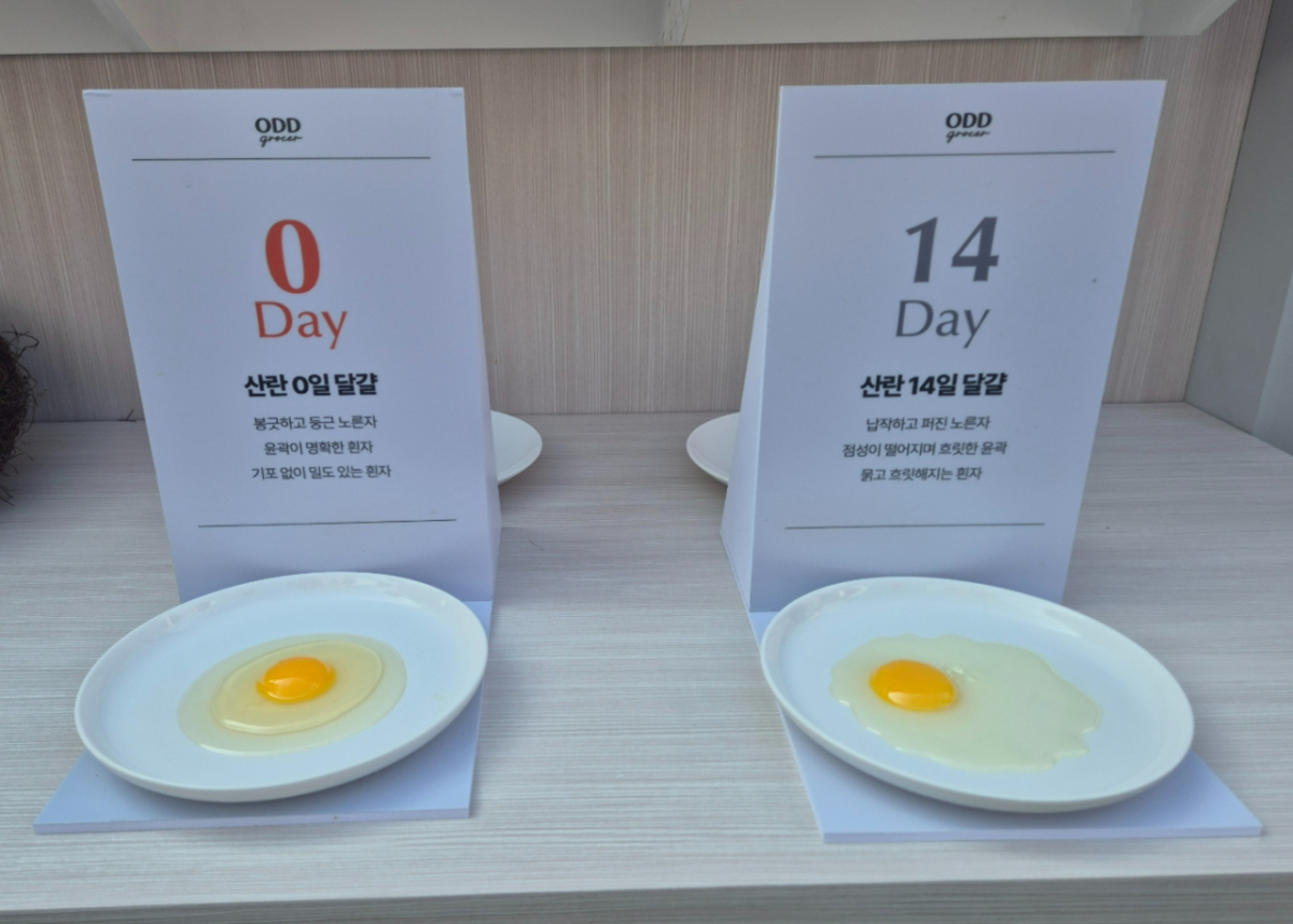 한편 NS푸드페스타에서도 오드그로서를 경험할 수 있는 공간이 들어섰다. 가장 신선한 순간의 재료를 관람객들이 직접 볼 수 있게 꾸민 것이다. 당일 산란 달걀과 산란 14일이 지난 달걀의 차이를 보여주고 있는게 대표적이다. 하림 관계자는 "당일 산란 달걀은 노른자가 봉긋하고 흰자 윤곽이 명확하고 기포 없이 밀도 있는게 특징이라면 14일 지난 달걀은 흰자가 무너져 있고 노른자는 탱글함이 떨어진다"면서 "오드그로서에선 당일 산란 달걀만 취급하고 있어 소비자들은 매일 고소하고 맛있는 달걀을 즐길 수 있다"고 전했다.
