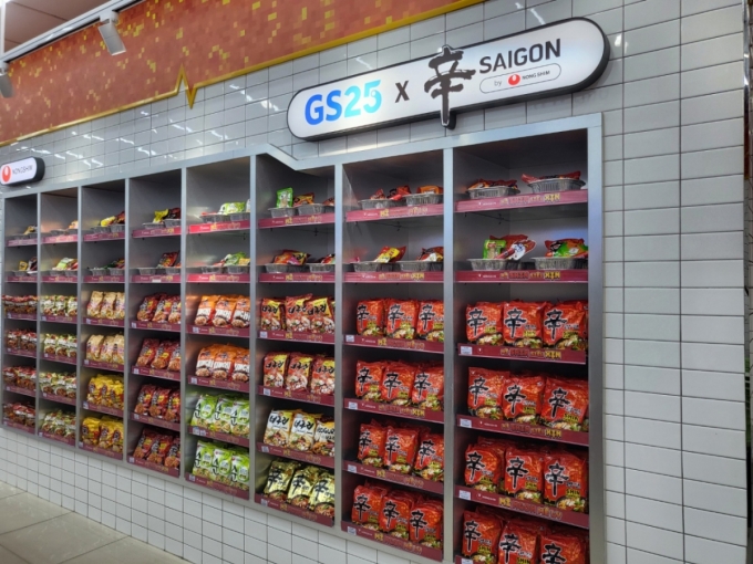 지난달 10일 오후에 찾은 베트남 호치민시 1군 지역 벤 응에(Ben Nghe)에 위치한 GS25 편의점 앞엔 빼곡하게 들어선 오토바이들이 눈에 들어왔다. 오토바이를 타고 방문하는 손님이 많다보니 베트남엔 상점마다 주차를 도와주는 요원이 따로 있을 정도다. 그렇게 바쁘게 오고가는 오토바이들 사이로 GS25와 농심(369,500원 ▲2,500 +0.68%) 신라면을 상징하는 '辛사이공(Saigon)'이란 낯익은 간판 속 글씨가 눈에 띄었다. 이곳은 GS25와 농심의 컬래버레이션(협업·이하 컬래버) 매장이다. 농심 제품만을 위한 특화 공간이 별도로 마련된 편의점이다.