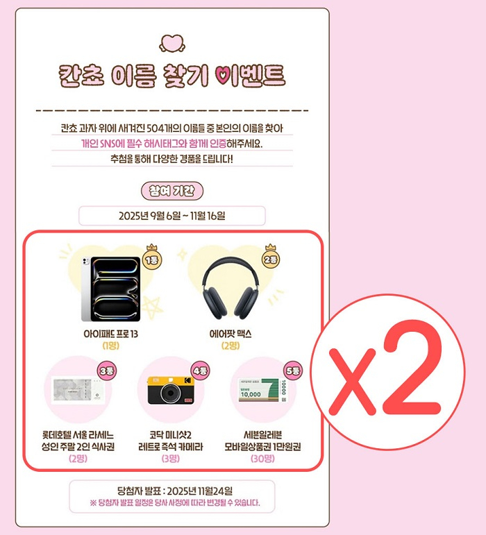 지난달 6일 시작해 오는 11월16일까지 진행되는 이번 이벤트는 칸쵸 알과자 위에 새겨진 504개의 이름 중 본인과 사랑하는 사람의 이름을 찾아 SNS에 인증 사진을 올린 소비자에게 추첨을 통해 경품을 증정하는 행사다.