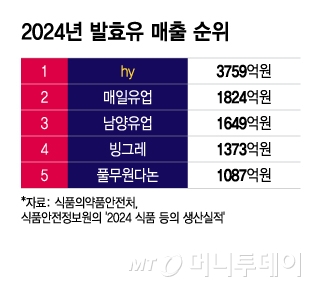 7일 식품의약품안전처와 식품안전정보원의 '2024 식품 등의 생산실적'에 따르면 발효유 매출 1위는 3759억원을 기록한 hy가 차지했다. 이는 국내 판매와 수출을 모두 더한 수치다. 이어 매일유업(35,350원 ▲550 +1.58%)(1824억원), 남양유업(51,200원 ▲1,600 +3.23%)(1649억원), 빙그레(72,200원 ▲1,700 +2.41%)(1373억원), 풀무원다논(1087억원) 순으로 집계됐다.