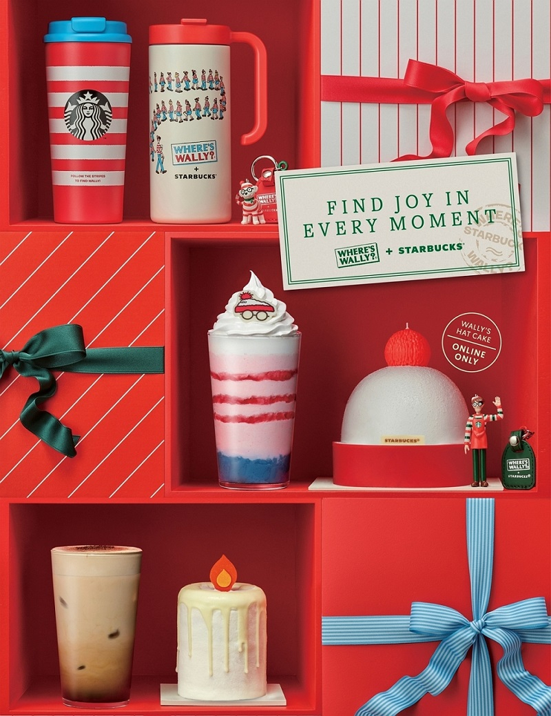 콜라보레이션 음료인 '월리 체리 푸딩 크림 프라푸치노'는 체리 드리즐, 블루 바닐라 푸딩 등으로 월리의 트레이드 마크인 빨간 스트라이프 티셔츠와 파란색 청바지를 형상화해 인증샷 욕구를 자극한다. '월리 레드벨벳 치즈 케이크', '월리 베어리스타 마카롱'도 월리 모티브 장식으로 재미 요소를 더했다.