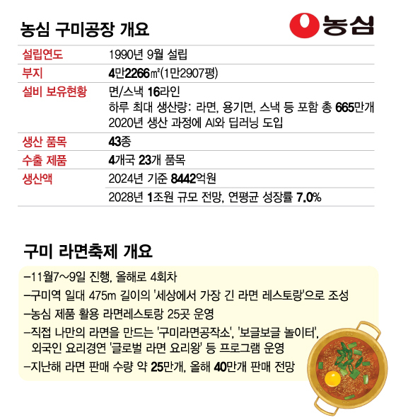 구미라면축제의 모태가 된 농심 구미공장은 국내 신라면 생산량의 약 75%를 담당한다. 김상훈 농심 구미공장 공장장은 "신라면 고속라인에서는 1분에 최대 600개의 제품이 생산된다"며 "하루 생산량은 약 500만명에 달하는 경상북도민 한 사람에게 하나씩 라면을 줄 수 있는 정도"라고 말했다. 농심 구미공장은 국내 최초로 라면 공장에 인공지능(AI) 기반 사물 인식 프로그램을 도입해 포장 결함 등을 자동으로 인식한다. 이는 신라면은 물론 짜파게티, 너구리 등 주력 제품에 대한 일관된 품질을 유지할 수 있도록 하는 기반이라는 게 농심 측 설명이다.