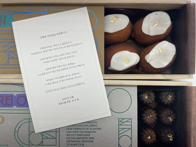 삼표그룹은 수능과 관련해 임직원 자녀 수험생들에게 프랑스 전통 디저트인 '까눌레'와 '레몬파운드'로 구성된 선물을 전달했다. 매년 수능을 앞두고 응원 선물을 전달하며 수험생과 학부모를 격려하고 있다. 올해 선물엔 정도원 회장의 메시지도 함께 담겼다. 정 회장은 "수험생 여러분이 그동안 쌓아온 뜨거운 노력과 인내의 시간이 앞으로의 단단한 기초가 될 것"이라며 수험생과 가족들에게 따뜻한 격려의 마음을 전했다.