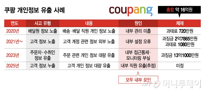 1일 관련업계에 따르면 쿠팡은 2020년 배달원 정보 노출을 시작으로, 2021년 고객 정보 노출, 2023년 주문자·수취인 정보 유출 등 총 3차례의 개인정보 사고를 겪었는데 모두 내부 원인에 의해 발생했다. 이 과정에서 낮은 수위의 제재를 받으면서 과징금·과태료 등이 총 16억원에 그쳤다. 업계에서는 "사고 성격상 결코 가볍지 않았는데 제재가 단발성에 머물며 구조적 개선으로 이어지지 못한 것"이라는 진단이 나왔다