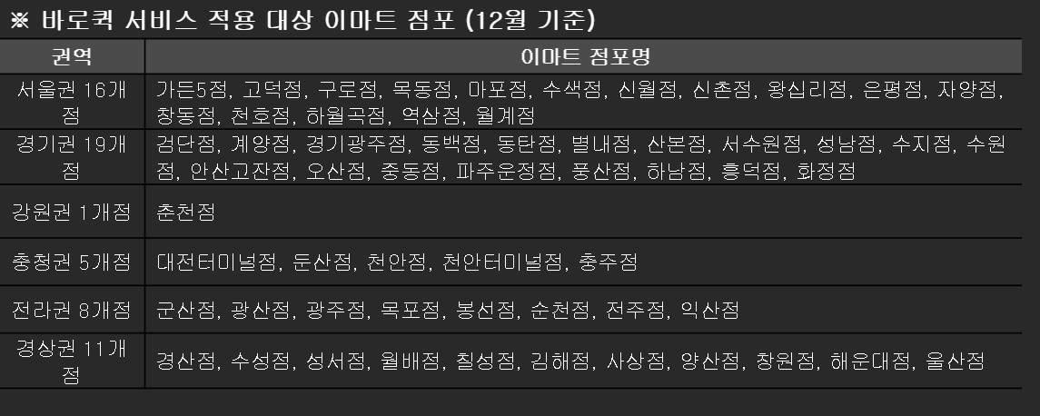 현재 바로퀵 서비스가 운영 중인 이마트 점포는 서울권 16곳, 경기권 19곳, 강원권 1곳, 충청권 5곳, 전라권 8곳, 경상권 11곳 등이다. 쓱닷컴은 이마트와 협업해 바로퀵 운영 상품도 지난 9월 대비 80% 가량 늘어난 1만1000여개로 확대했다.