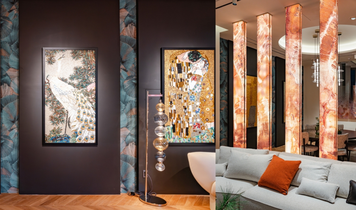 # 지난 19일 오후 서울 지하철 신사역에서 10분 거리에 위치한 이탈리아 명품 공간 브랜드 '시치스(SICIS)' 쇼룸에 들어서자 6성급 고급 호텔 로비에 있는 기분이 들었다. 한국에선 볼수 없었던 이국적인 '공간 디자인'으로 꾸며진 이곳엔 럭셔리한 자재로 각종 장식이 설치돼 있었다. 천연 미네랄을 활용한 1000여 종의 모자이크 타일과, 유리 사이에 금속, 섬유 등 아트패널을 입힌 특허 자재 Vetrite(베트리테)는 특유의 색감과 질감으로 소장 욕구를 불러일으켰다. 모자이크 패턴에서 영감을 받은 고급 실크, 울 소재의 텍스타일과 조명 시스템 역시 시치스만의 독창적인 기술이다. 18세기 나폴레옹 시대의 마이크로 모자이크 기법을 현대적으로 되살린 하이엔드 주얼리 라인업도 눈에 띄었다.