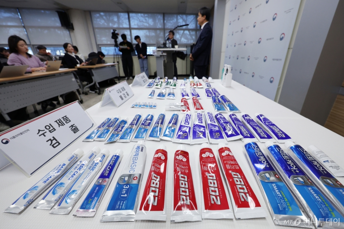 ![[서울=뉴시스] 김진아 기자 = 20일 서울 양천구 서울지방식약청 브리핑실에서 열린 애경산업 2080 치약의 트리클로산 검출 관련 브리핑에서 트리클로산이 검출된 수입 제품이 진열돼 있다. 식품의약품안전처는 애경산업이 수입한 2080 치약 6종과 국내 제조 치약 128종을 전수조사한 결과, 수입 제품 870개 제조번호 중 754개(86.6%)에서 최근 국내에서 사용 금지된 물질인 트리클로산이 최대 0.16% 검출됐다고 20일 발표했다. 반면 애경산업이 국내에서 직접 제조한 128종은 모두 불검출로 나타났다. 2026.01.20./사진=김진아](https://thumb.mt.co.kr/cdn-cgi/image/f=avif/21/2026/01/2026012017023772064_1.jpg)