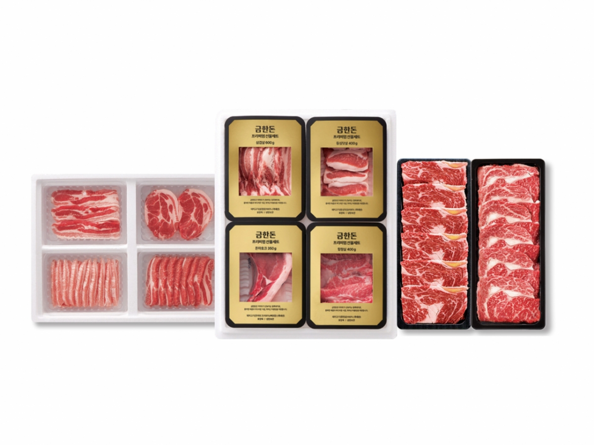 이마트는 이번 설 육즙이 풍부하고 마블링이 우수한 특이 품종인 '얼룩돼지(YBD)'를 금괴모양으로 포장한 '금한돈 냉장 한돈 모둠 세트(7만7220원)'를 선보였다. 또 5만원 이하 가성비 수요를 겨냥해 지난해 설 완판된 '항공직송 돈육 구이 특선(4만2800원)' 물량을 2배 이상 확대했다.