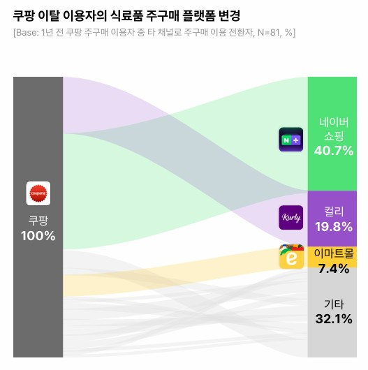 또 쿠팡 이탈 소비자가 가장 많이 향한 곳은 네이버 쇼핑(40.7%)으로 조사됐다. 이탈 소비자의 19.8%는 컬리로, 7.4%는 이마트몰로 이용 플랫폼을 바꿨다.