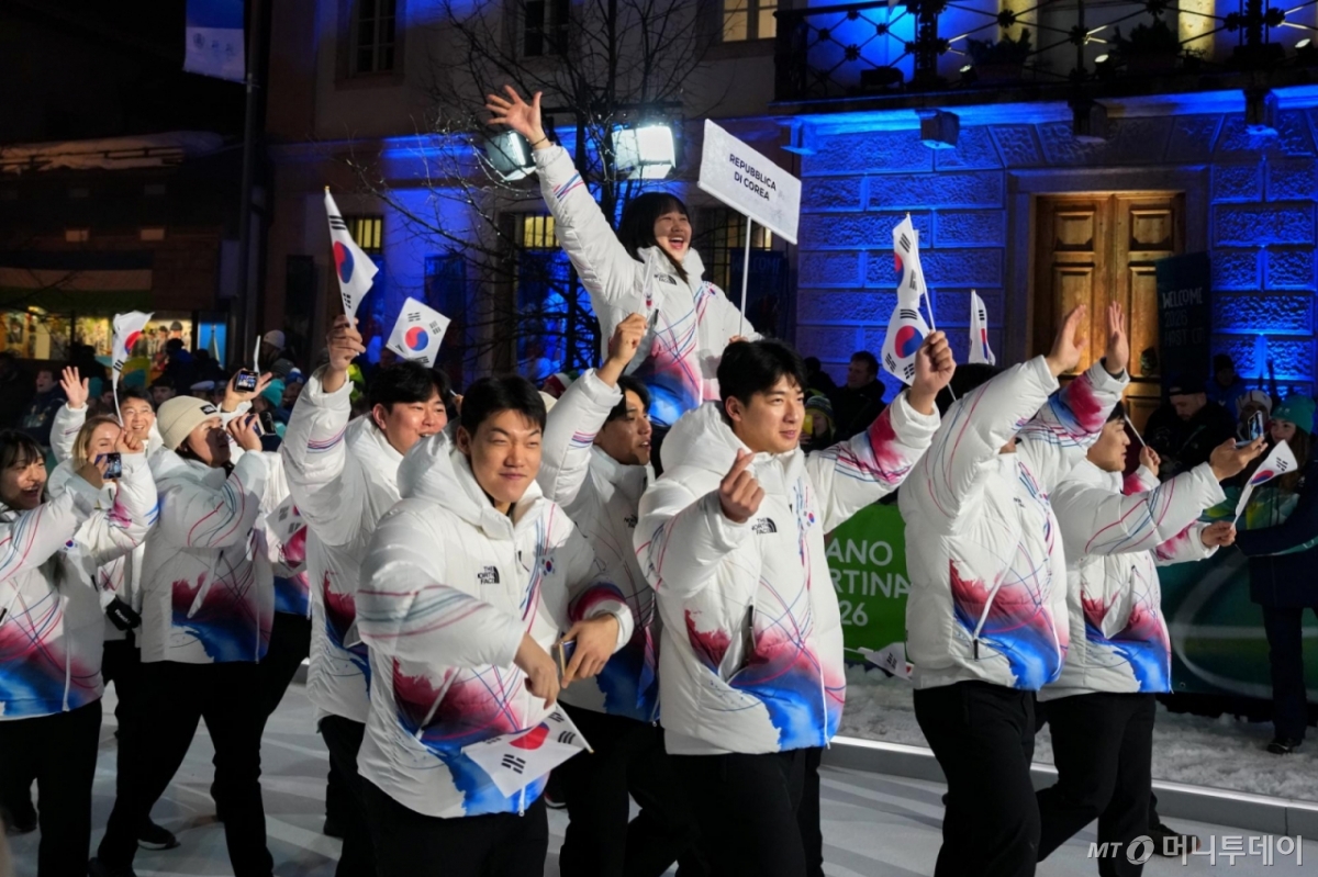 ![[코르티나담페초=AP/뉴시스] 대한민국 선수단이 6일(현지 시간) 이탈리아 코르티나담페초 디보나 광장에서 열린 2026 밀라노·코르티나담페초 동계올림픽 개막식에서 태극기를 흔들며 입장하고 있다. 사상 처음으로 복수의 개최지에서 열리는 이번 대회의 개막식은 밀라노의 산시로 올림픽 스타디움과 코르티나담페초 등 여러 지역에서 동시에 진행됐다. 개회식 주제도 ‘조화’를 뜻하는 이탈리아어 ‘아르모니아’(Armonia)다. 2026.02.07. /사진=민경찬](https://thumb.mt.co.kr/cdn-cgi/image/f=avif/21/2026/02/2026021316123382809_1.jpg)