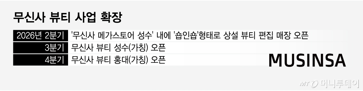 이에 앞서 무신사는 2분기 중 2000평 규모의 '무신사 메가스토어 성수' 내에 800여 개 브랜드가 입점하는 숍인숍 형태의 상설 뷰티 편집 매장을 먼저 선보일 계획이다. 이어 하반기에 단독 로드숍을 잇달아 열어 오프라인 시장에서도 영향력을 확대할 방침이다.