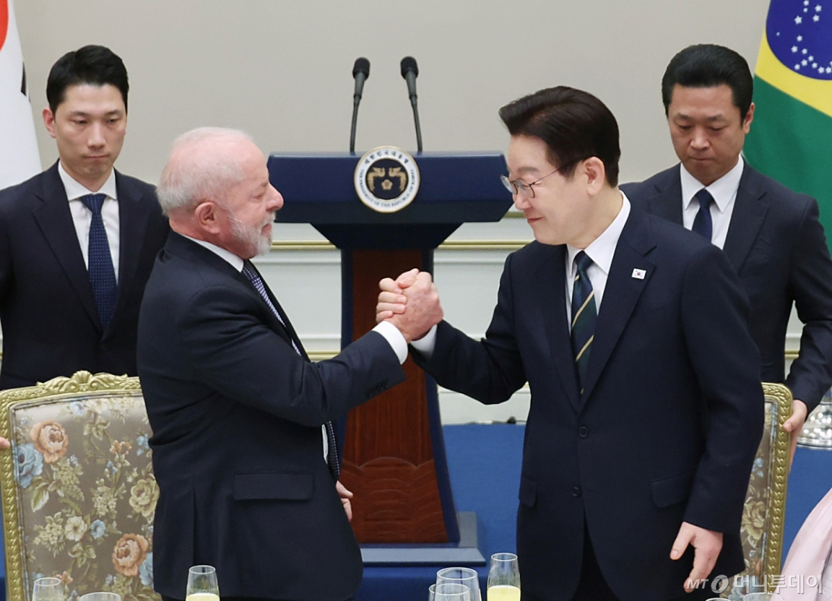 ![[서울=뉴시스] 최동준 기자 = 이재명 대통령이 23일 청와대에서 열린 브라질 루이스 이나시우 룰라 다 시우바 대통령 국빈 방한 환영 만찬에서 룰라 대통령의 답사를 들은 뒤 손을 맞잡고 있다. (청와대통신사진기자단) 2026.02.22. /사진=최동준](https://thumb.mt.co.kr/cdn-cgi/image/f=avif/21/2026/02/2026022414223940097_1.jpg)