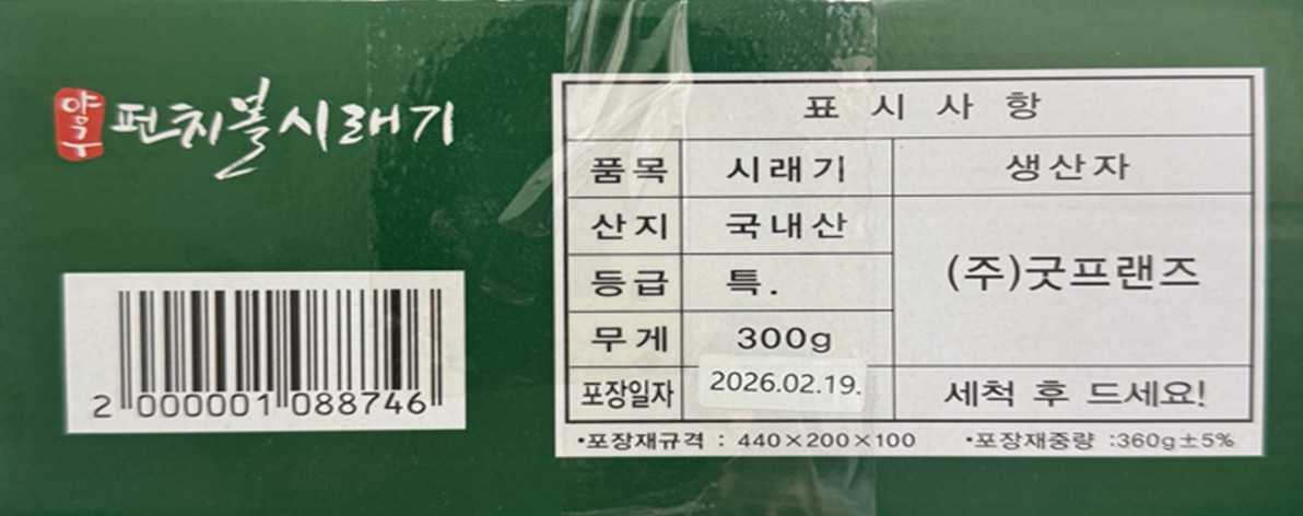 식약처는 해당 제품을 판매 중단하고 회수 조치한다. 회수 대상은 '굿프랜즈(서울 송파구 소재)'가 포장·판매한 제품으로 제품명은 '양구 펀치볼시래기'다. 포장일은 '2026. 2. 19.'다.