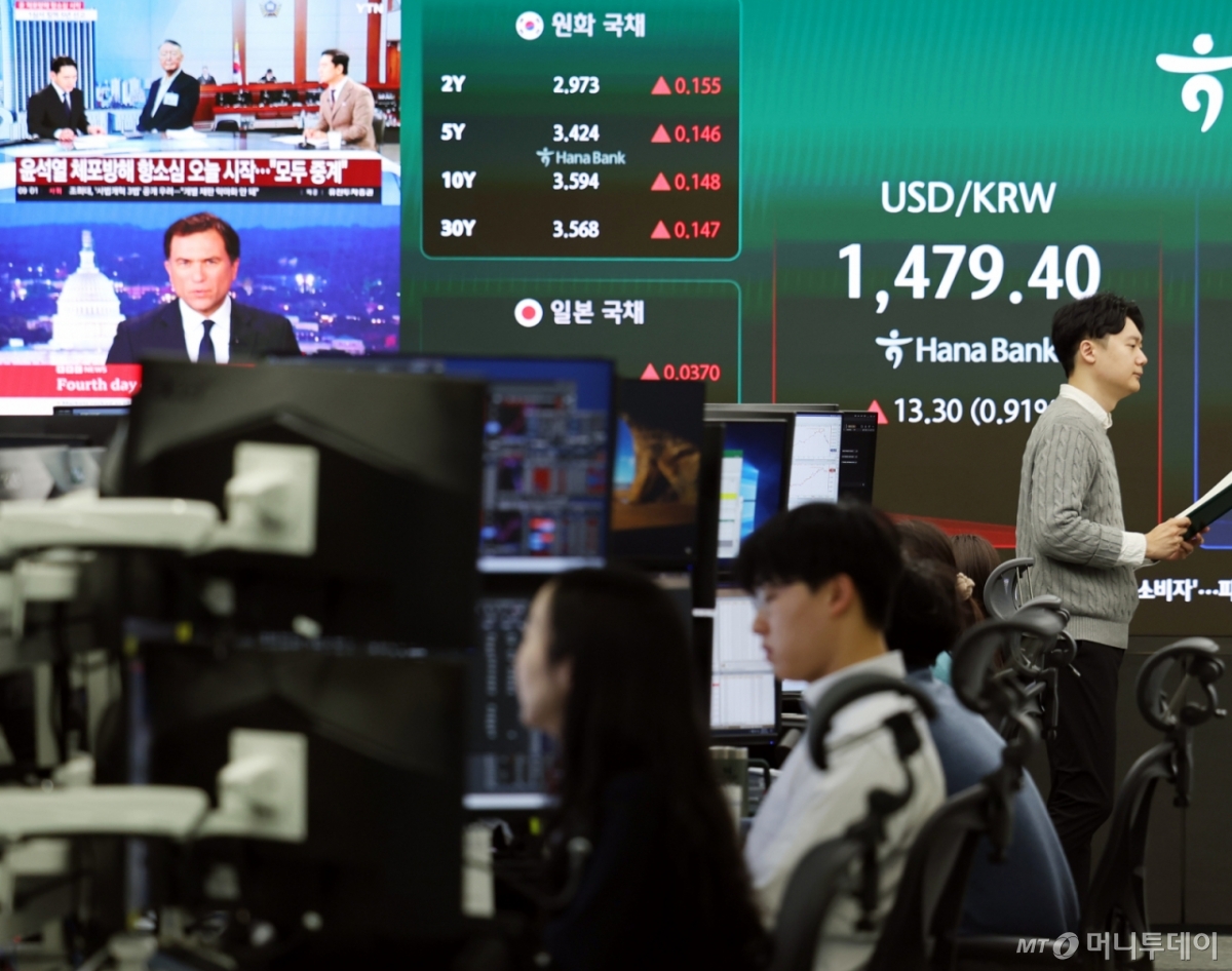 ![[서울=뉴시스] 박주성 기자 = 4일 오전 서울 중구 하나은행 딜링룸에서 딜러들이 업무를 하고 있다. 서울 외환시장에서 원·달러 환율은 전 거래일 주간거래 종가(1466.1원)보다 12.9원 오른 1479.0원에 출발했다. 2026.03.04. park7691@newsis.com /사진=](https://thumb.mt.co.kr/cdn-cgi/image/f=avif/21/2026/03/2026030413422398262_1.jpg)