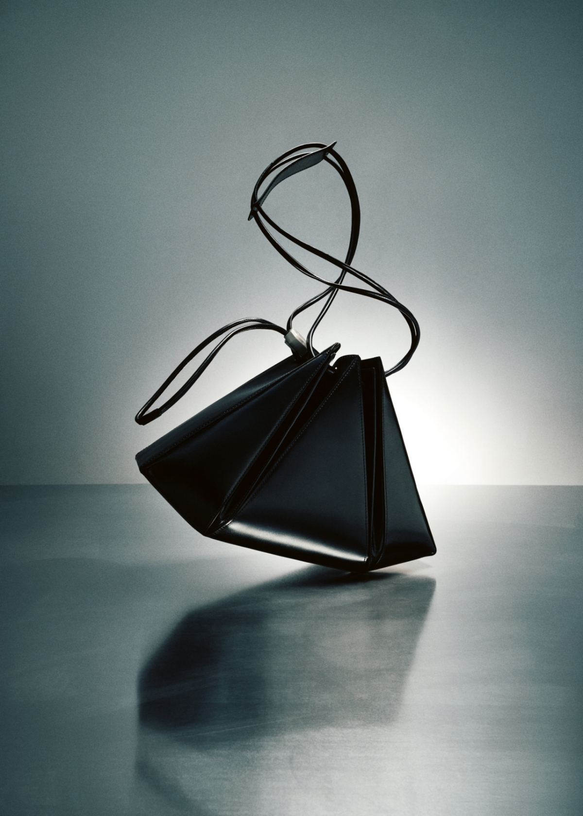 구호x톰 딕슨 폴드백은 아코디언 형태의 폴딩 디자인 기법을 적용해 직사각형에서 삼각형으로 가방의 형태가 자연스럽게 변환되도록 했다.