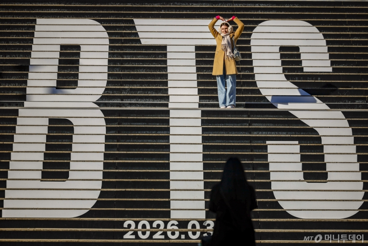 ![[서울=뉴시스] 정병혁 기자 = 20일 서울 종로구 세종문화회관 계단을 찾은 외국인 여행객들이 방탄소년단(BTS) 래핑을 배경으로 사진을 찍고 있다. 외국인의 한국에 대한 호감도가 2018년 조사 이래 가장 높은 82.3%로 나타났다. '2025년도 대한민국 국가이미지 조사 결과'에 따르면 외국인의 한국에 대한 호감도는 전년(79.0%) 대비 3.3%p 상승한 82.3%로, 2018년 조사를 시작한 이래 최고 수준을 기록했다. 호감도가 80%를 넘은 것은 2021년(80.5%) 이후 두 번째이자 4년 만이다. 2026.01.20./사진=정병혁](https://thumb.mt.co.kr/cdn-cgi/image/f=avif/21/2026/03/2026030615061930292_1.jpg)