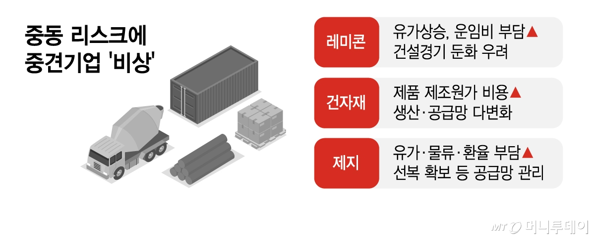 11일 업계에 따르면 레미콘·건자재·제지 등 중견 제조업체들은 이란을 둘러싼 중동 지역의 긴장 고조에 따른 비용 상승 가능성을 예의주시하며 대응 전략을 살피고 있다. 에너지 비용과 물류비 상승이 동시에 들이닥치면서 수익성 압박 단계까지 도달했다는 우려가 공통적으로 나온다.