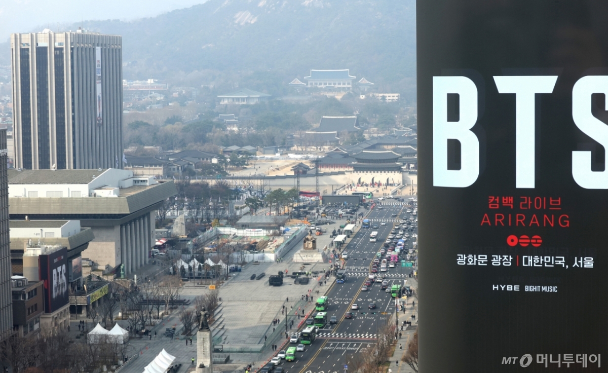 ![[서울=뉴시스] 김진아 기자 = 방탄소년단(BTS)의 서울 광화문광장 컴백 공연을 닷새 앞둔 16일 오전 서울 종로구 광화문광장에서 무대 설치 작업이 진행되고 있다. 2026.03.16. bluesoda@newsis.com /사진=김진아](https://thumb.mt.co.kr/cdn-cgi/image/f=avif/21/2026/03/2026031709415783073_1.jpg)
