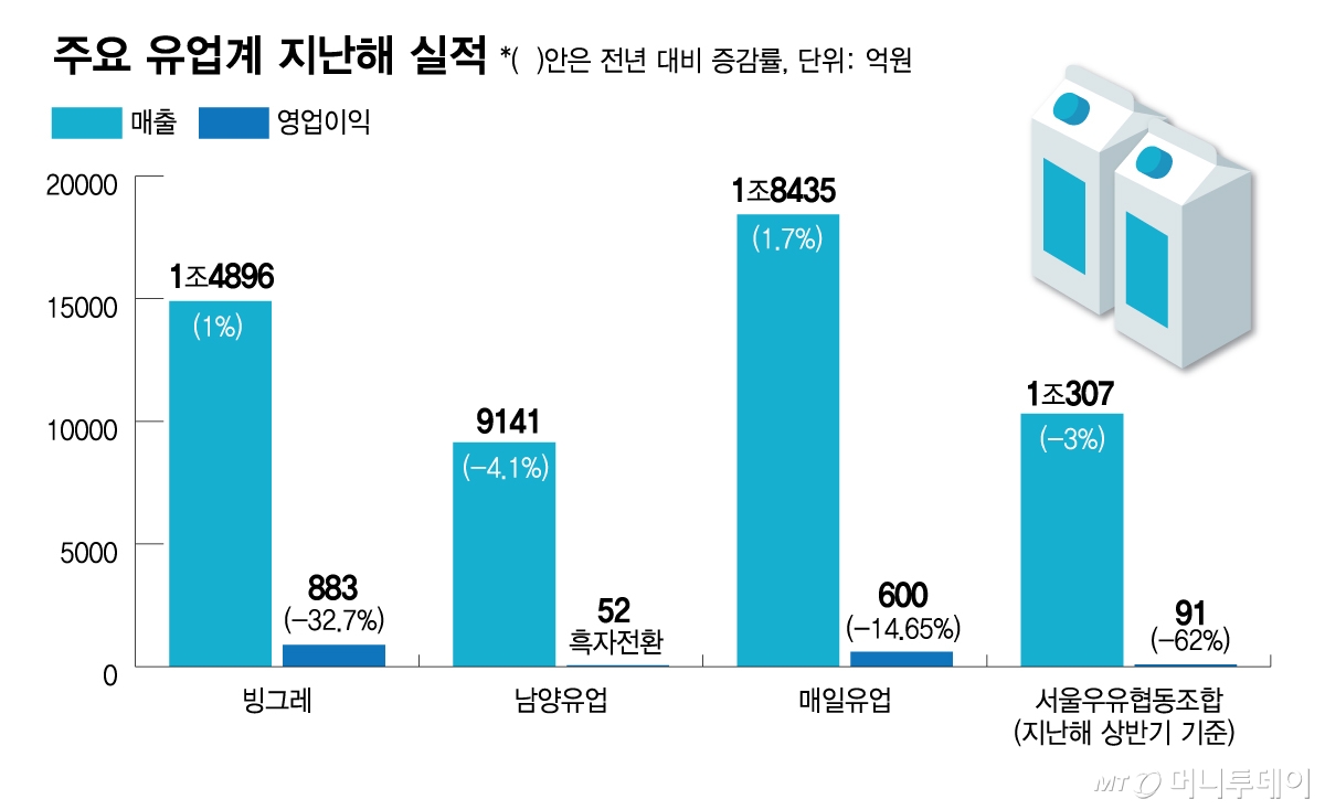 서울우유협동조합 역시 고전 중이다. 서울우유의 지난해 상반기 영업이익은 91억원으로 전년 동기 대비 62% 급감했으며 299억원이었던 당기순이익은 211억원으로 적자 전환했다. 서울우유는 이달 말 사업보고서를 통해 지난해 전체 실적을 공개할 예정이지만 상반기 흐름을 고려할 때 수익성 개선이 쉽지 않았을 것이라는 관측이 나온다.