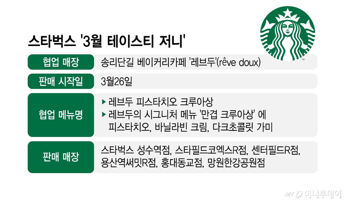 21일 외식업계에 따르면 스타벅스는 오는 26일부터 '3월 테이스티 저니'(Tasty Journey) 메뉴로 송리단길 디저트·베이커리카페 '레브두'와 협업한 '레브두 피스타치오 크루아상'을 일부 매장에서 선보인다. 레브두의 시그니처 메뉴 '만겹 크루아상'에 피스타치오와 바닐라빈 크림·다크초콜릿을 더해 재해석했다.