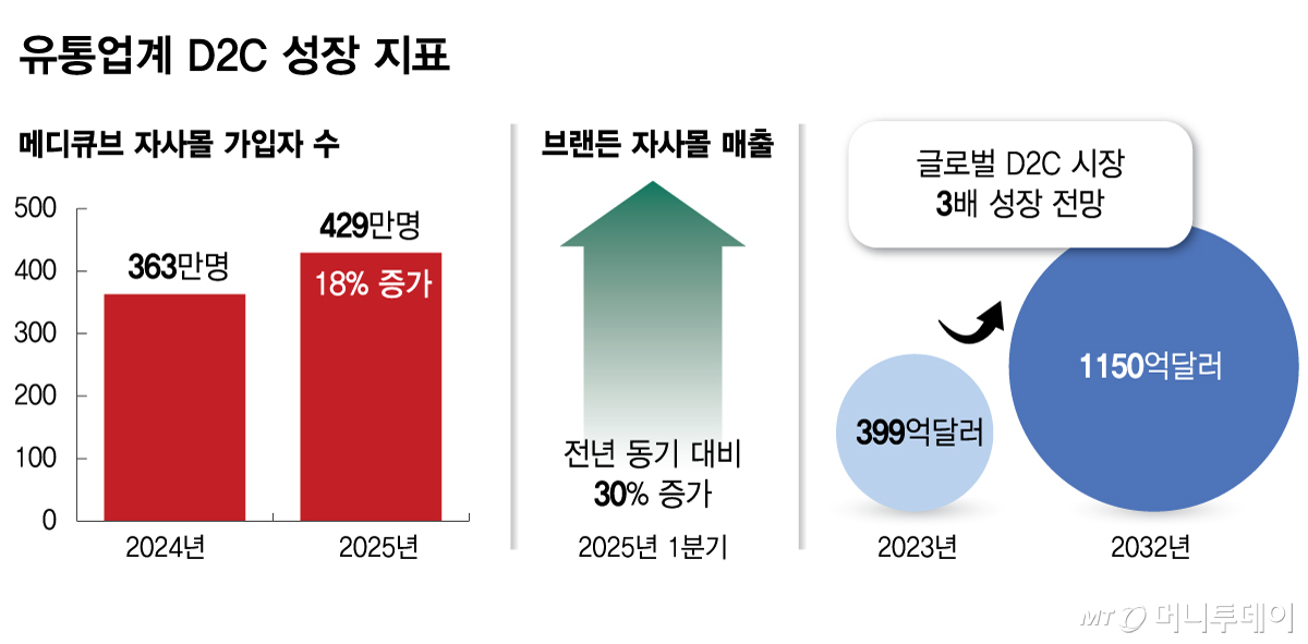 기업들이 D2C를 강화하는 가장 큰 이유는 수익성과 데이터다. 플랫폼 중심 구조에서는 수수료 부담이 불가피하지만 자사몰을 활용하면 유통 단계를 줄여 마진을 확보할 수 있다. 동시에 고객의 구매 이력과 행동 데이터를 직접 축적할 수 있어 마케팅과 상품 기획 전반에 활용 가능한 핵심 자산을 확보하게 된다. 시장 환경도 이런 흐름을 뒷받침한다. 글로벌 D2C 플랫폼 시장은 2023년 약 399억달러에서 2032년 1150억달러 규모로 확대될 것으로 전망된다.