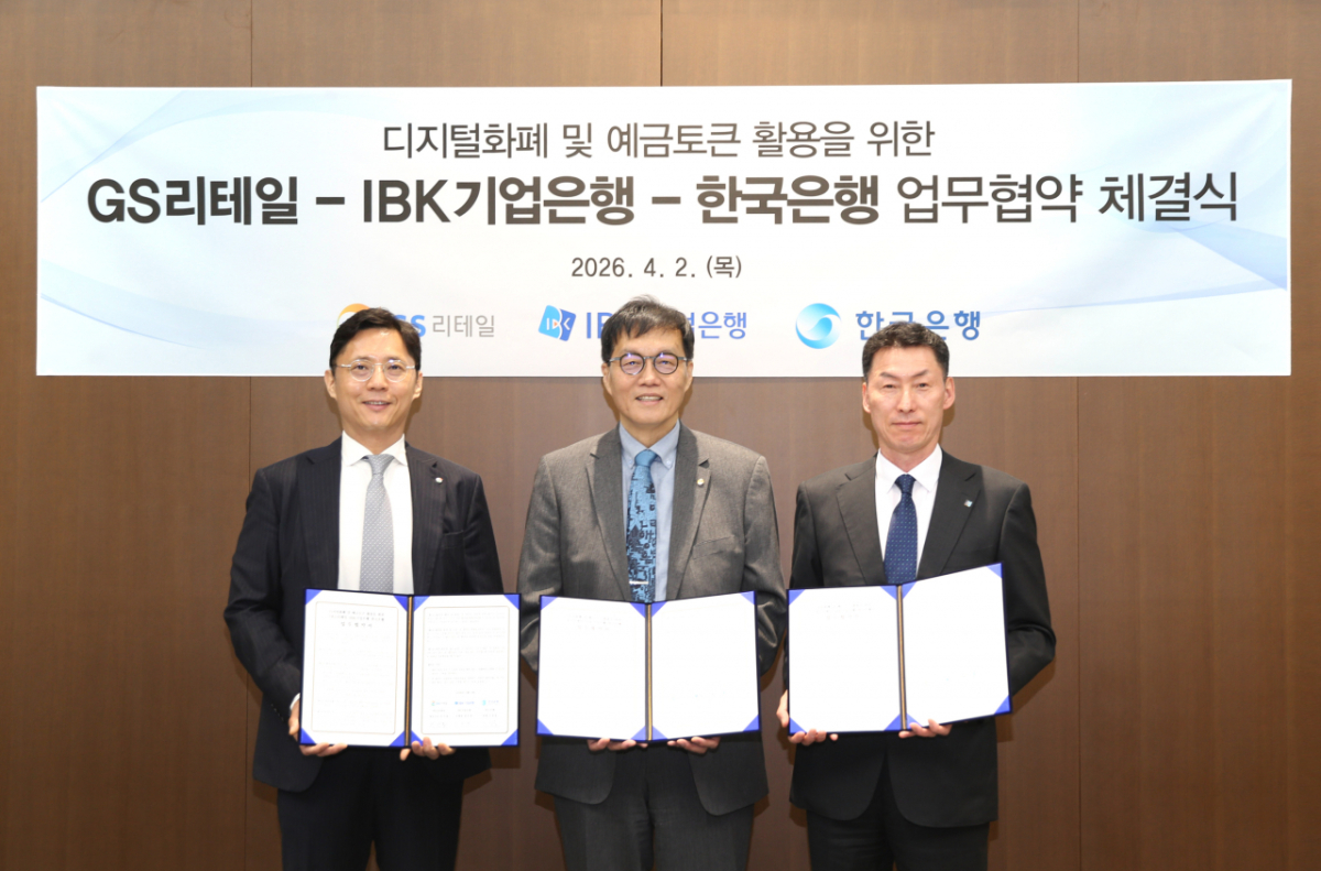 GS리테일은 한국은행, IBK기업은행과 전략적 파트너십(이하 업무협약)을 체결하고 예금 토큰 상용화 인프라를 구축한다고 2일 밝혔다.