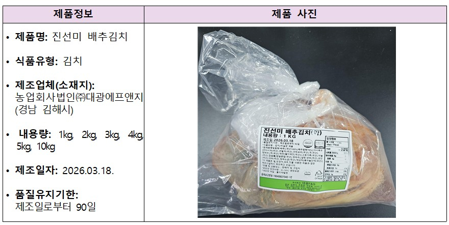식품의약품안전처는 3일 식품제조·가공업체 농업회사법인 대광에프앤지(경남 김해시 소재)가 제조·판매한 '진선미 배추김치'에서 식중독균인 여시니아 엔테로콜리티카가 검출됐다고 발표했다.