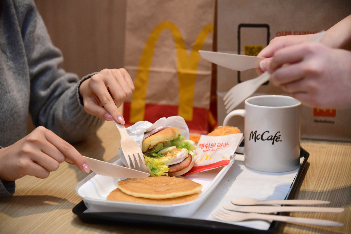 한국맥도날드는 현재 아이스크림 컵과 테이크아웃 음료·커피 컵에 재생 플라스틱 원료를 사용한 제품을 사용해 연간 400톤의 플라스틱을 줄이고 있다. 올해 1월부터는 팬케이크 제품 용기 재질을 생분해성 포장재(Bio-PE)로 전환했고 2월부터는 팬케이크와 함께 제공하는 포크·나이프를 일회용 플라스틱 대신 나무 소재 제품으로 일부 매장부터 순차 적용 중이다.