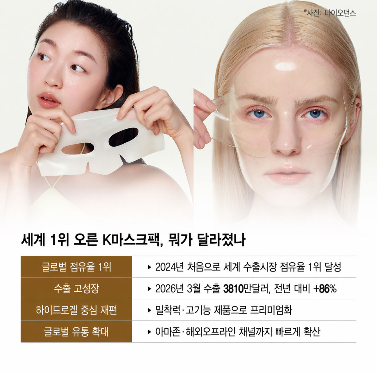 K뷰티 마스크팩이 '필수 쇼핑템'에서 진화해 수출 효자 품목으로 자리매김하고 있다. 해외 관광객들이 한국을 찾으면 대량으로 구매하던 대표 아이템이 이제는 글로벌 시장 점유율과 수출 증가를 동시에 견인하는 핵심 품목으로 부상하는 흐름이다.