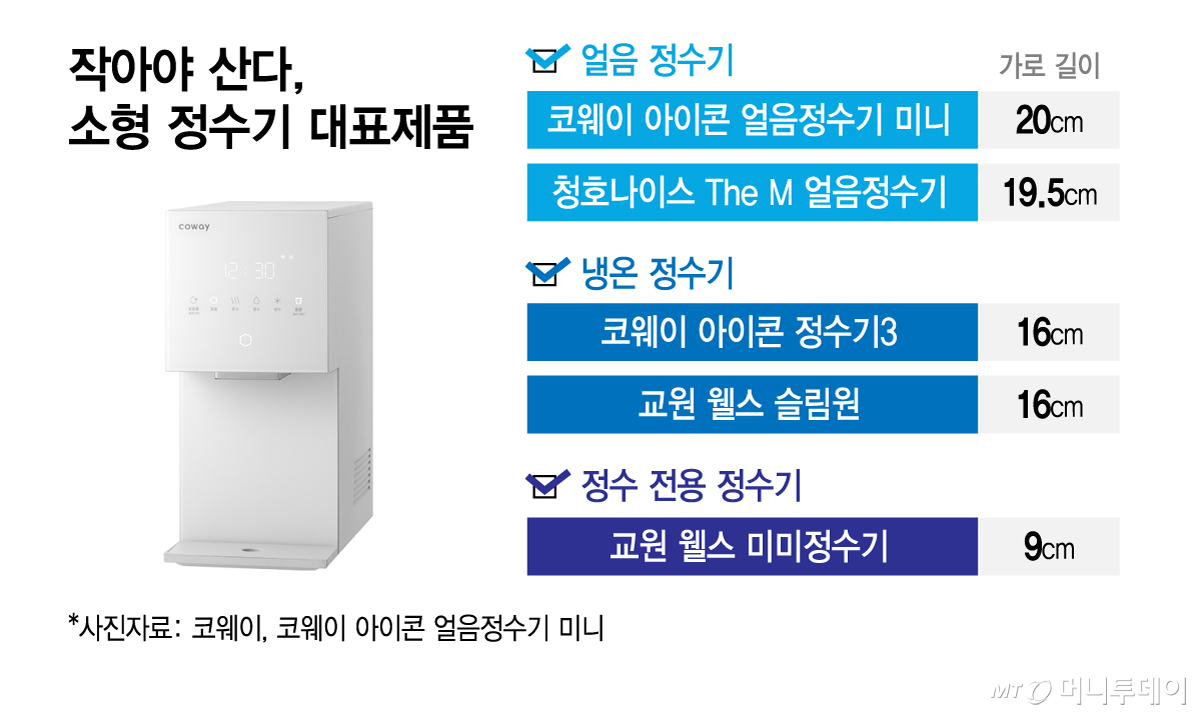 일반 정수기 시장으로 눈을 돌리면 초소형화 경쟁은 더 극단적이다. 직수형 냉온정수기는 가로 길이 16㎝대까지 줄었고 코웨이 '아이콘3'와 교원 웰스 '슬림원' 등이 대표적이다. 냉온 기능이 없는 정수 전용 제품은 한 자릿수까지 내려왔다. 교원 웰스 '미미 정수기'는 가로 길이가 약 9㎝에 불과하다.