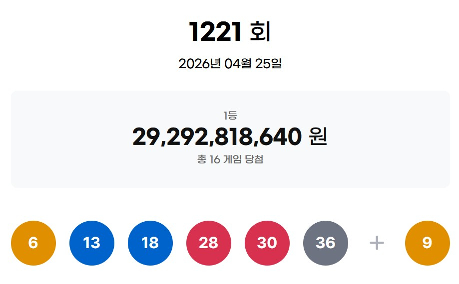 로또복권 운영사 동행복권이 25일 실시한 제1221회 로또복권 추첨 결과 1등 당첨번호는 6·13·18·28·30·36, 보너스 번호는 9로 결정됐다.
