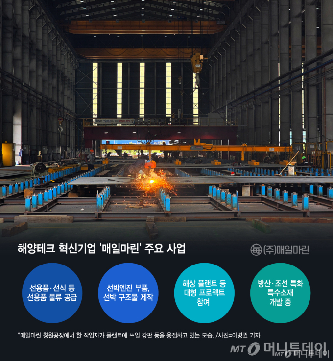 지난 23일 방문한 경남 창원시 매일마린의 창원공장 내부는 비릿한 금속 냄새로 가득했다. 특수강과 철판이 맞닿는 순간마다 용접 불꽃이 사방으로 튀었고 철판이 울리는 묵직한 소리는 작업장에 낮게 퍼졌다. 공장 외부에는 대형 구조물들이 안전 구역에 정리된 채 운반을 기다리고 있었다.