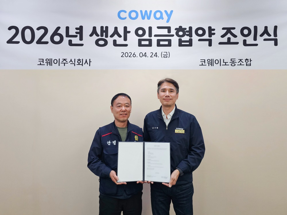 이날 조인식엔 김기배 코웨이 생산구매본부장과 임재환 생산 코웨이노동조합 위원장 등 노사 대표들이 참석해 협약서에 서명하며 상생의 의지를 다졌다. 노사는 이번 임금협약을 통해 기본급 인상 등에 합의했다.