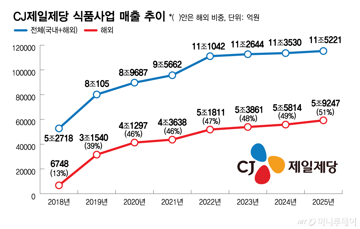 특히 해외 매출은 1조5682억원으로, 지난해(1조4881억원) 같은 기간보다 5% 증가할 전망이다. CJ제일제당은 지난해 식품 분야에서 11조5221억원의 매출을 기록했는데 해외사업이 5조9247억원으로 사상 처음 전체 매출에서 해외 매출 비중이 50%를 넘어섰다. 해외 식품사업이 CJ제일제당의 성장을 견인하고 있는 상황에서 올해도 전체 해외 매출이 처음으로 6조원을 넘어서는 등 이같은 분위기를 이어갈 전망이다.