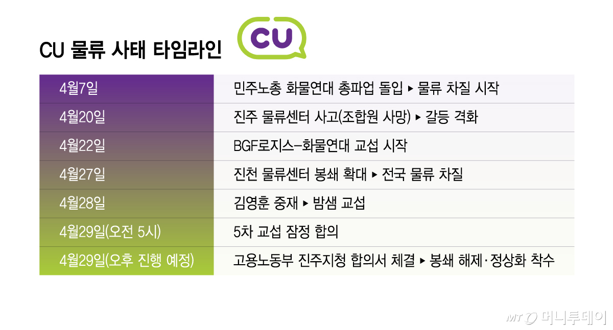 편의점 CU 물류를 담당하는 BGF로지스와 민주노총 화물연대가 단체합의서 체결을 앞두고 막바지 협의를 이어가면서 장기간 이어진 물류 갈등이 봉합 국면에 들어서고 있다. 전국 단위로 확산됐던 편의점 물류 차질도 점차 해소 수순에 들어갈 것으로 보이며 유통업계 전반에는 안도감이 확산되는 분위기다.
