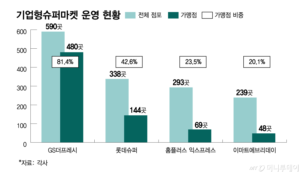 30일 유통업계에 따르면 국내 SSM 롯데슈퍼, GS더프레시, 홈플러스 익스프레스, 이마트에브리데이의 전국 매장 1460개 중 가맹점은 741개로 절반가량을 차지한다.