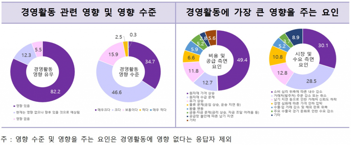 경영 위축의 주원인으로 비용·공급 측면에서는 원자재 가격 상승이 49.4%로 가장 큰 비중을 차지했고 원자재 수급 문제(12.7%), 유가 상승(11.8%) 등이 뒤를 이었다. 수요 측면에서는 소비심리 위축에 따른 내수 감소(30.1%), 거래처 주문 감소·취소(28.5%) 등이 주요 요인으로 꼽혔다.