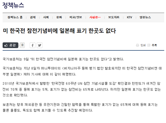 모두 국외 한국전 참전비의 일본해 표기 논란과 관련해 국가보훈처에서 나온 말이다. 국외 한국전 참전비의 일본해 표기에 대해서는 알지 못했으며, 일본해 표기는 사실 무근이라는 것이다.