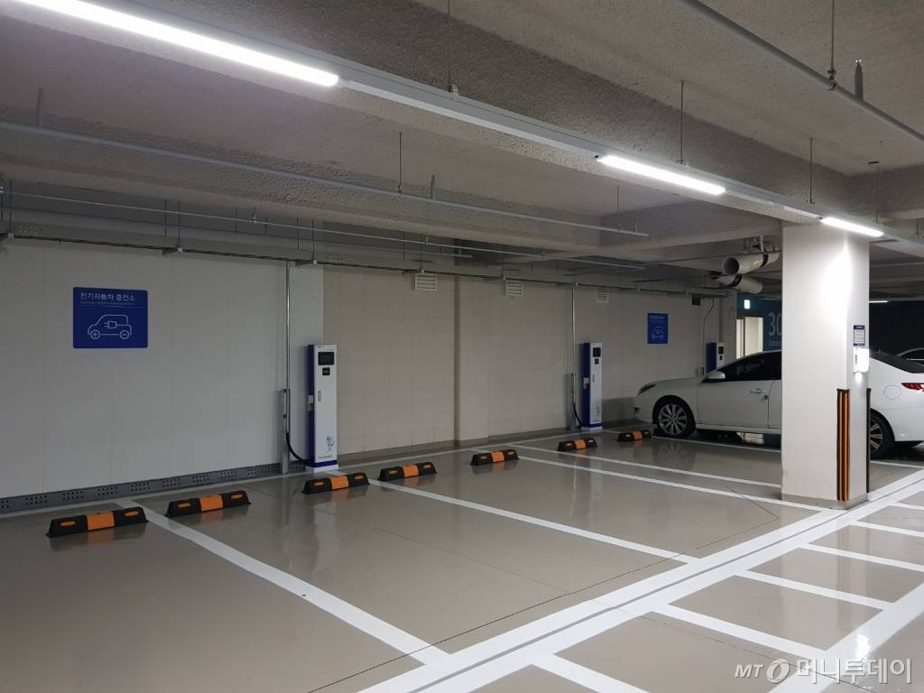 서울 시내 중심에 있는 2년된 신축 아파트 단지. 4단지 1900여세대로 이뤄진 이 아파트 지하주차장에는 '고정형 전기차 충전기 구역'이 있다. 2016년 6월 이후 500가구 이상 신축 아파트는 전기차 충전소 의무 설치 대상이기 때문이다.